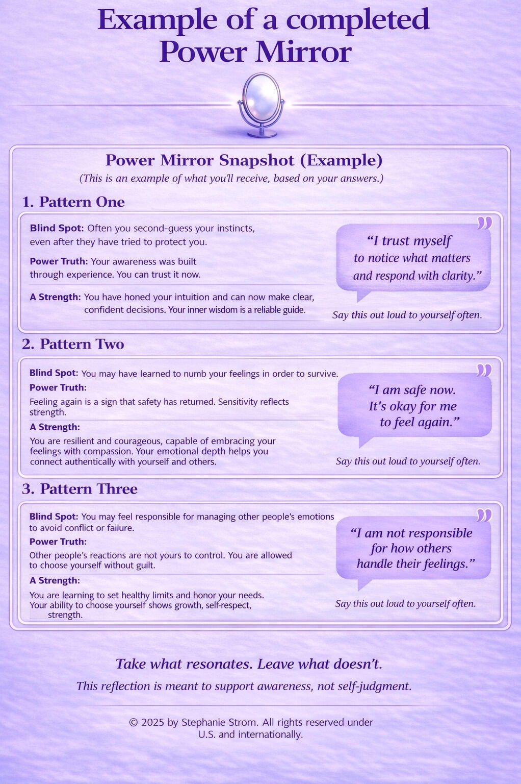 A clarity snapshot, not a test.Personalized Power Mirror Reflection: $25The Power Mirror is a detailed reflection designed to help you notice patterns in how you move through relationships, stress, and decision-making.It’s not a diagnosis or therapy.